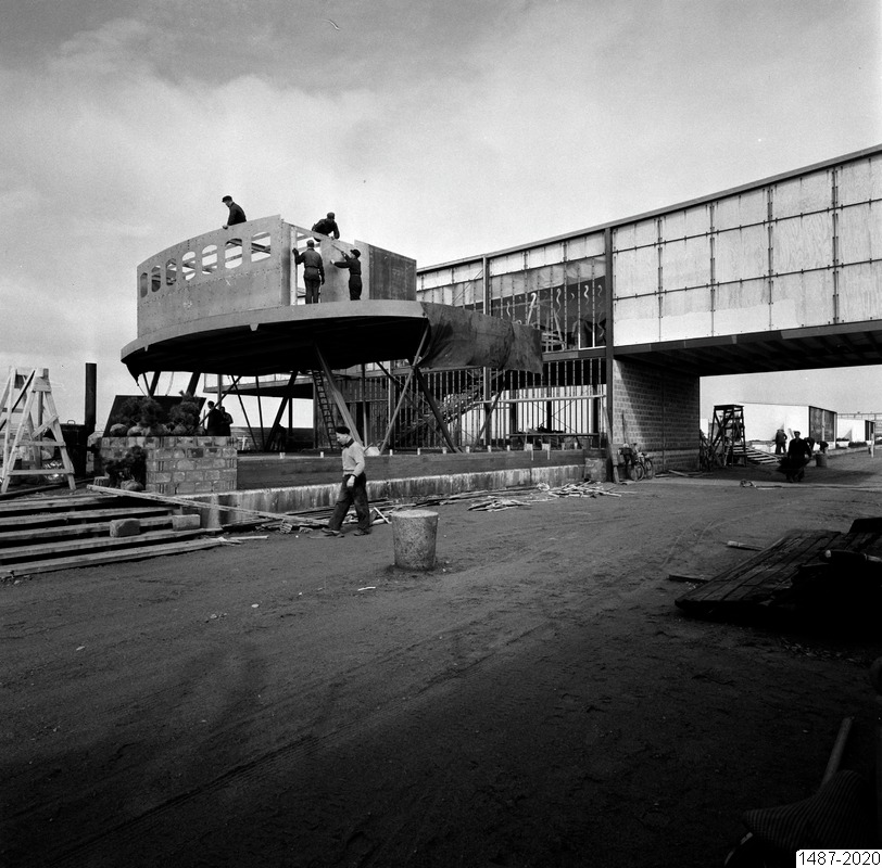 Bilden föreställer en paviljon i form av en komandobrygga under uppbyggnad. Där är byggnadsarbetare och byggnadsmaterial. I förgrunden en öppen yta.