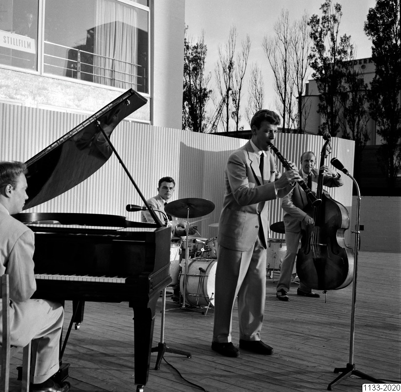 Bilden föreställer en orkesterpå Gröningens scen. I förgrunden en man vid en flygel, där bakom en man med blåsinstrument och sedan en man vid trummor. Längst bak en man med basfiol. I bakgrunden en fasad.