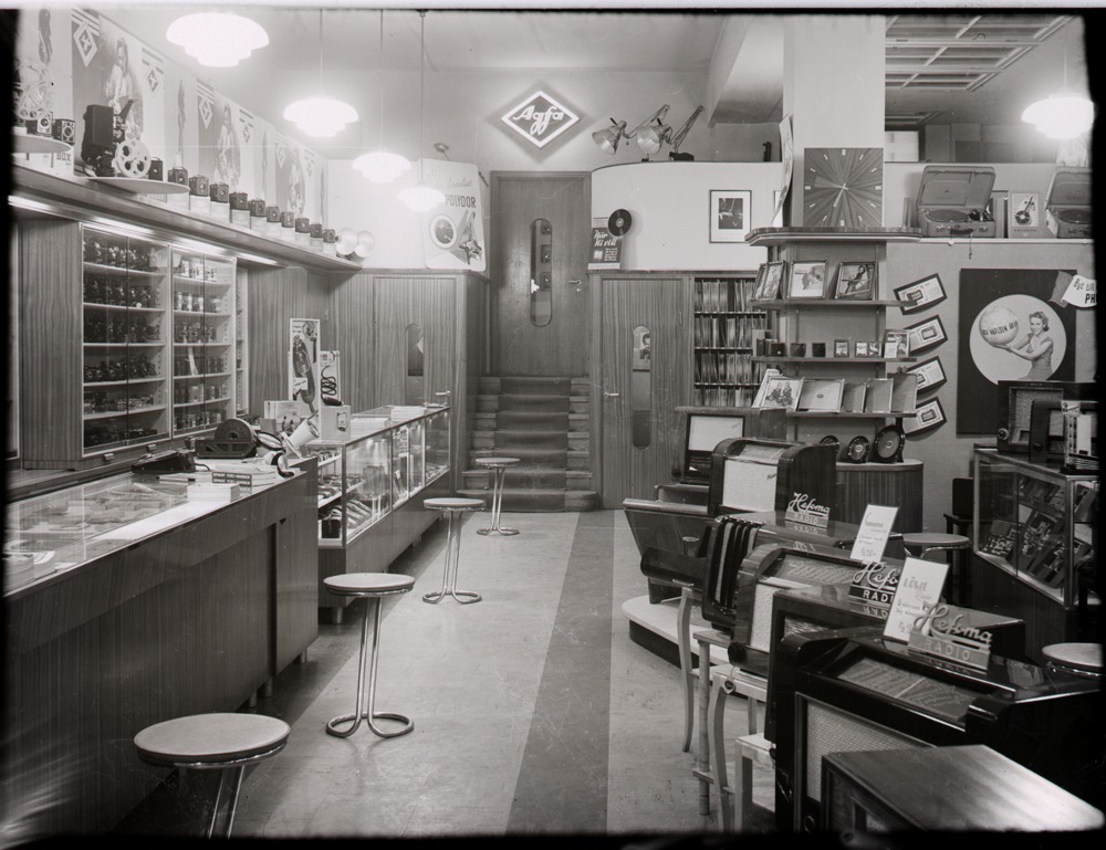 Fotografi som avbildar fotoavdelningen i Hefomas affär på Järnvägsgatan 3. På den bakre väggen ser vi även dörrar som leder till små bås där man kan lyssna på grammofonskivor ostört, dessa har bevarats och kan ses på posterna 2790 och 2791-2020. Tagen före ombyggnaden av affären 1957-58.