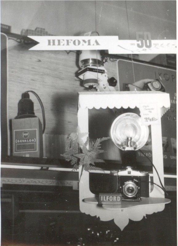 Fotografi som avbildar fotoavdelningen i Hefomas affär på Järnvägsgatan 3. Skylten och kameran verkar fira Hefomas 50-årsjubileum. Troligen tagen före ombyggnaden av affären 1957-58.