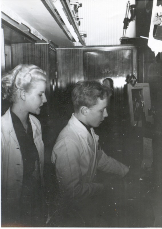 Fotografi som troligen avbildar fotoavdelningen i Hefomas affär på Järnvägsgatan 3. Här ser vi fotobiträde Ulla Cederholm till vänster och Ove Karlsson till höger. Se även post 2790 och 2791-2020 för de avbildade dörrarna i bakgrunden. Bilden är tagen före ombyggnaden 1957-58.