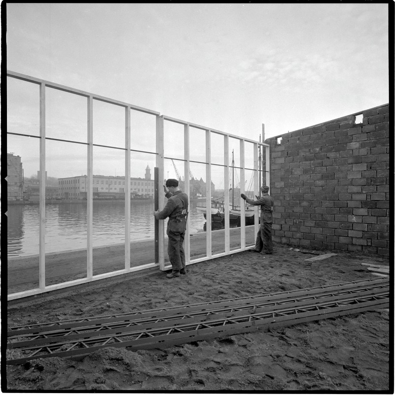 Bilden föreställer en paviljong under uppbyggnad. Till vänster murad fasad till höger glasfasad, samt två byggnadsarbetare.