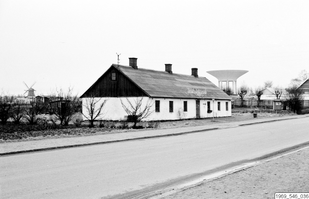 Statarlänga som tillhört Fredriksdal med mölla i och vattentorn i bakgrunden