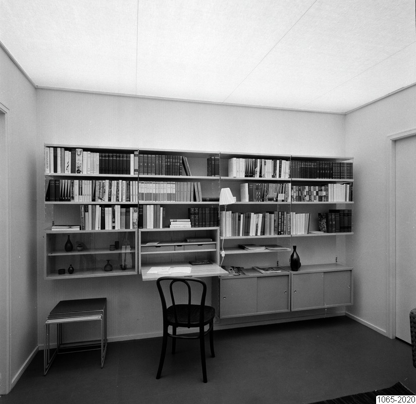 Bilden föreställer en bokhylla med skåp nedtill, där står en stol och ett bord.