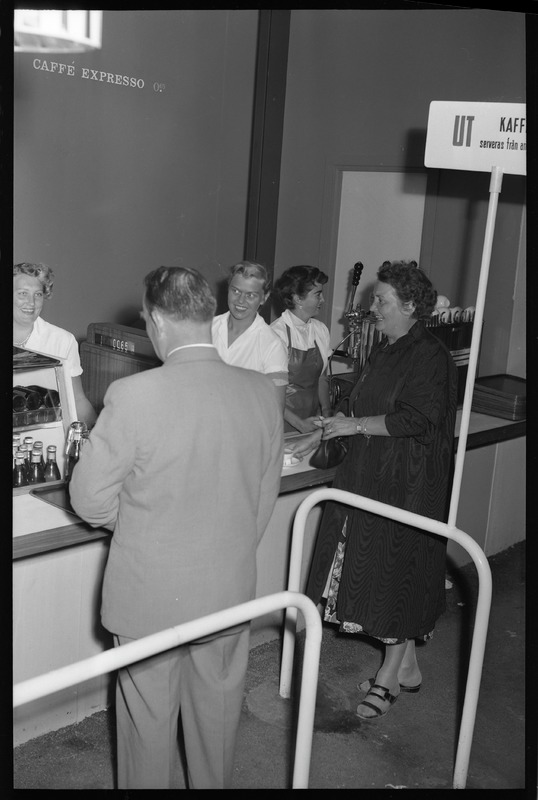 Bilden föreställer disken i en servering. Tre kvinnor bakom disken och två personer som handlar. På väggen står det Café expresso.