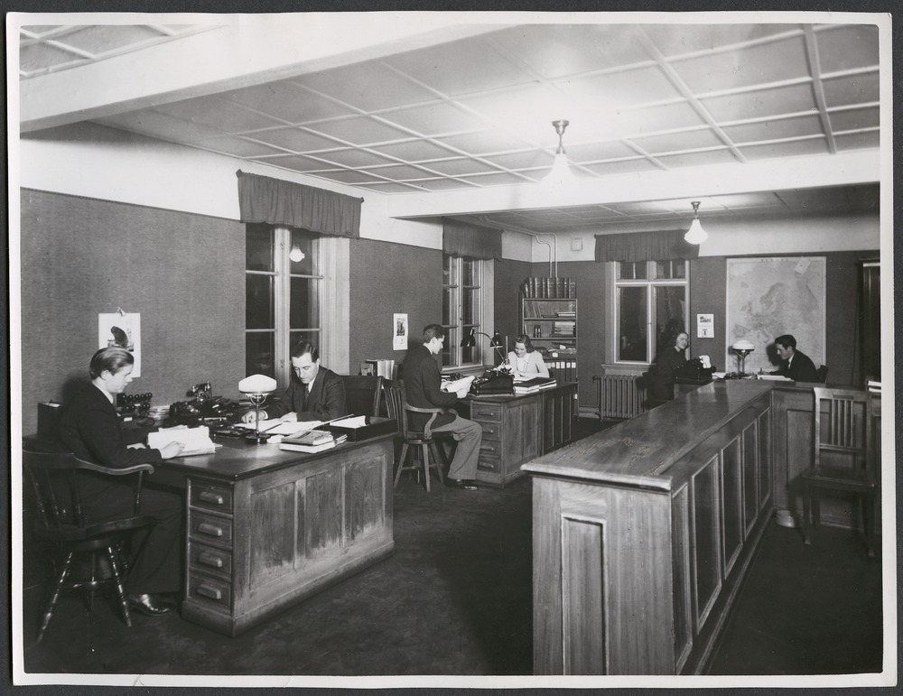 Bilden föreställer en kontorslokal med skrivbord och personal. Där är också någon form av disk. Rummet har fönster.
