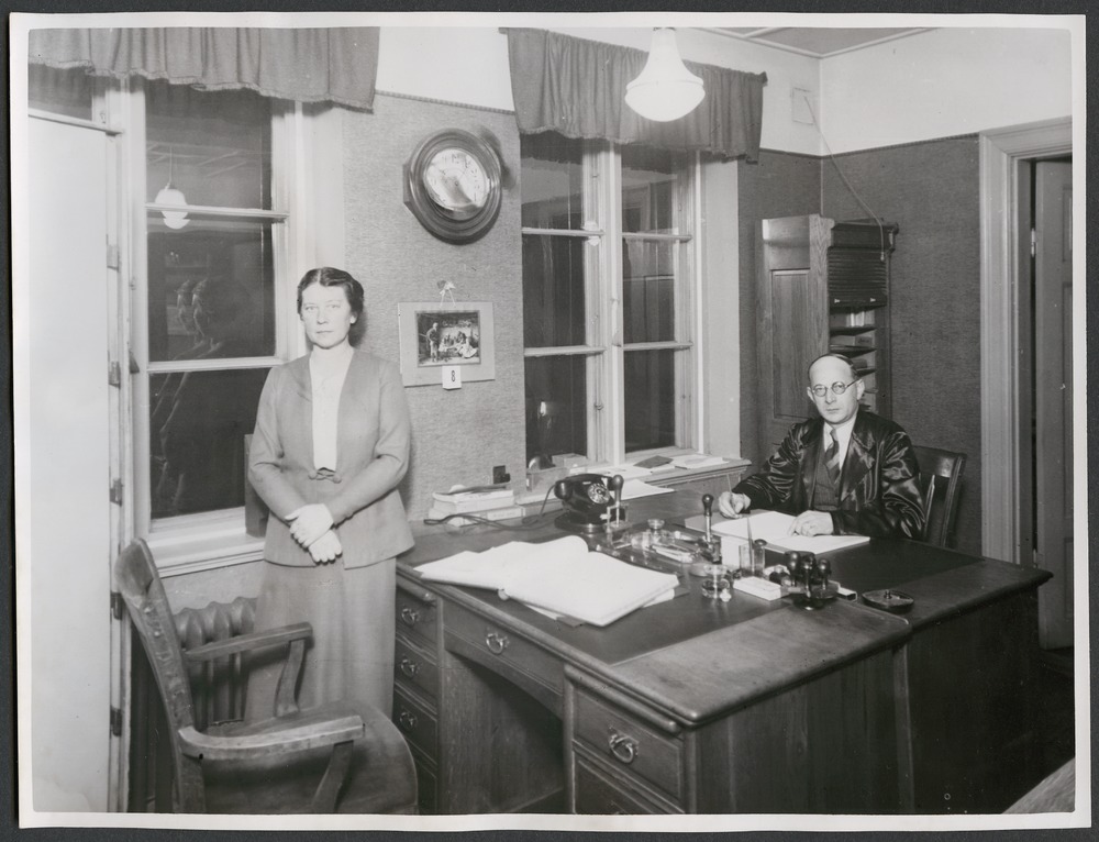 Bilden föreställer en kvinna och en man fotograferade vid varsitt skrivbord i ett rum med fönster
