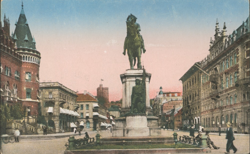 Vykort med bild från centrala Helsingborg. Mitt i bild Stortorget från väst mot öst. I förgrunden Stenbockstatyn, till vänster rådhuset och i bakgrunden Kärnan.