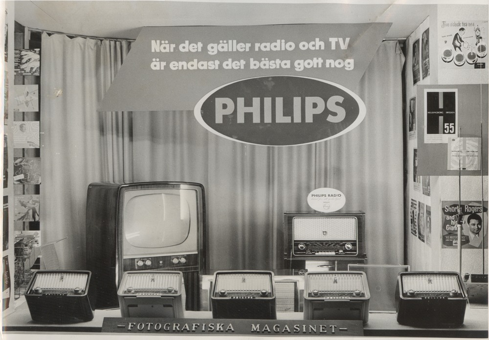 Fotografi som avbildar ett skyltfönster i Hefomas affär på Järnvägsgatan 3, i fönstret ser vi reklam för radio och televisionsapparater, inkl Philips. Bilden är troligen tagen 1955 eller åren runtom, reklam för H55 kan ses på höger sida av skyltfönstret.
