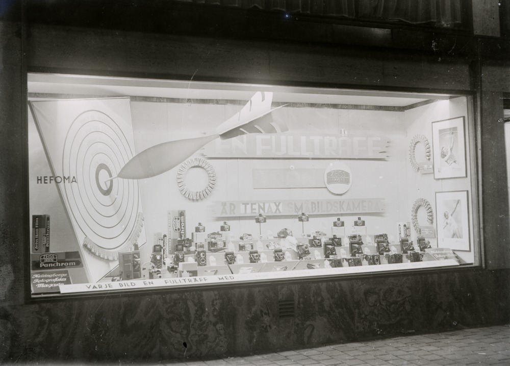 Fotografi som avbildar ett skyltfönster i Hefomas affär på Järnvägsgatan 3, i fönstret ser vi reklam för Tenax småbildskameror. Bilden är troligen tagen på 1940 eller 1950-talet.