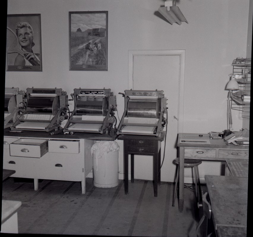 Laboratoriumet på Hefomas butik på Järnvägsgatan. Taget före ombyggnaden i slutet av 50-talet. Här avbildas högglanspressar.