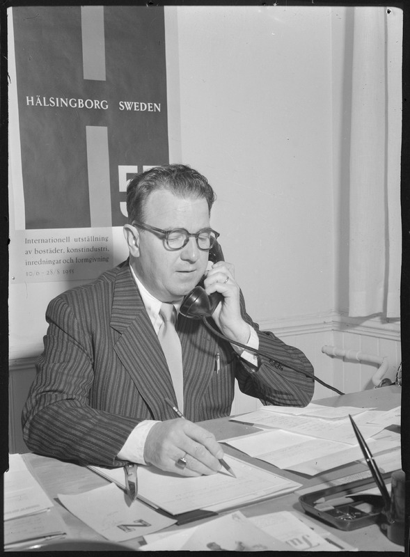 Bilden föreställer en man sittande vid ett skrivbord, fyllt av papper. Mannen pratar i telefon. På väggen bakom hänger en affisch för H55. Ett stort H med texten Hälsingborg Sweden ifälld samt siffrorna 55.
