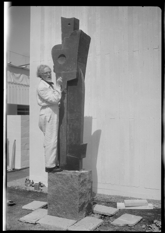 Bilden föreställer en staty på ett stenpodium framför en fasad. En man står på podiet och håller sig fast i skulpturen. Mannen heter Christian Berg och är konstnär.