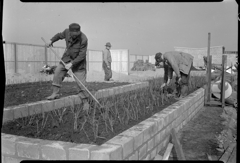 Bilden föreställer låga murar med rabatter inuti. Tre män håller på att anlägga rabtter med buskar. En av männen har ett trädgårdsredskap.