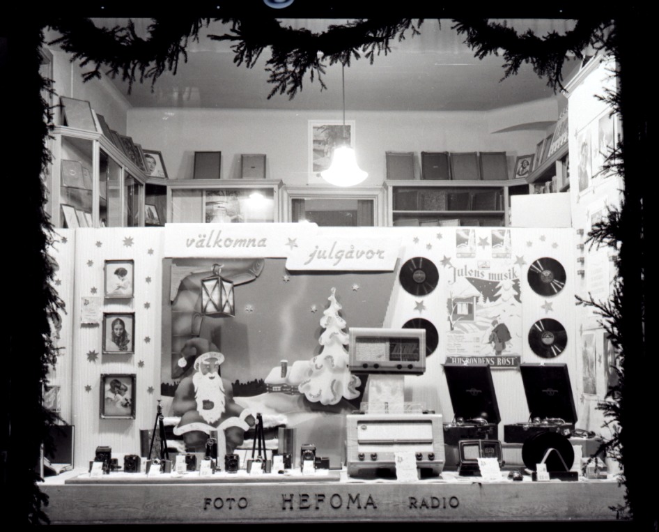 Fotografi som avbildar ett juldekorerat skyltfönster för Hefomas butik på Järnvägsgatan före ombyggnaden av fasaden.