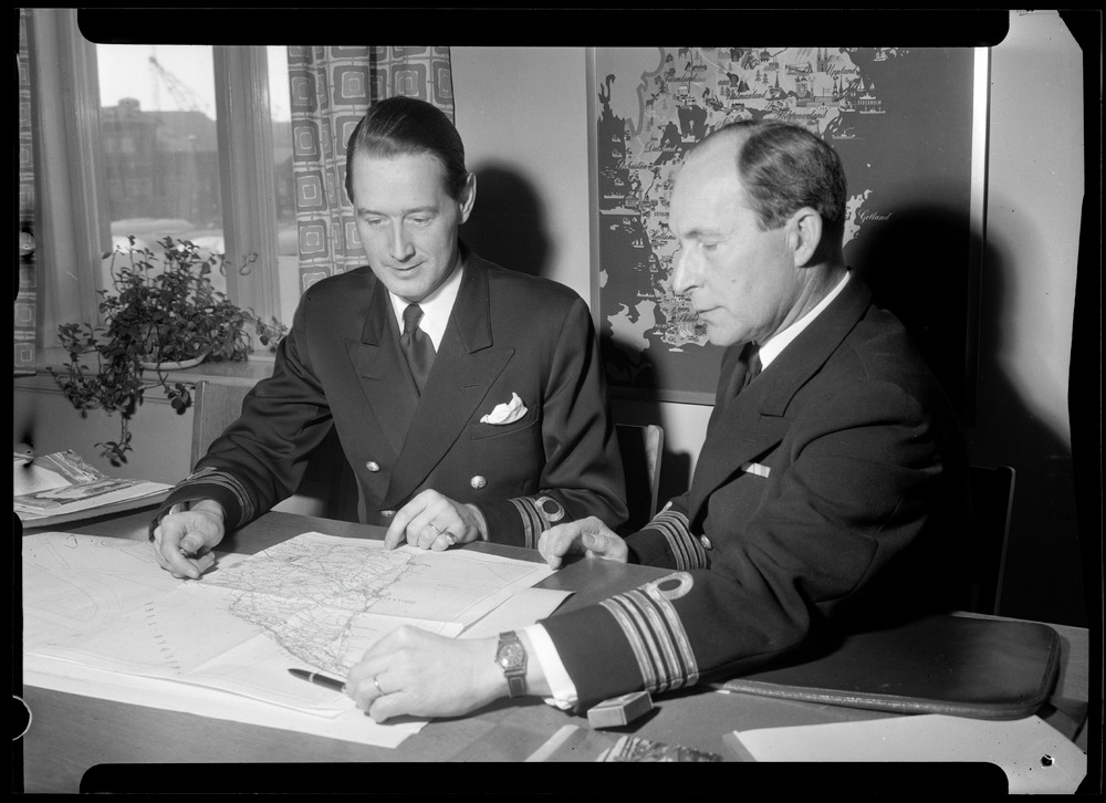Bilden föreställer två män i uniform, (sjöbefäl?) som sitter vid ett bord och tittar på en karta. På väggen bakom dem sitter också en karta, där är också ett fönster.
