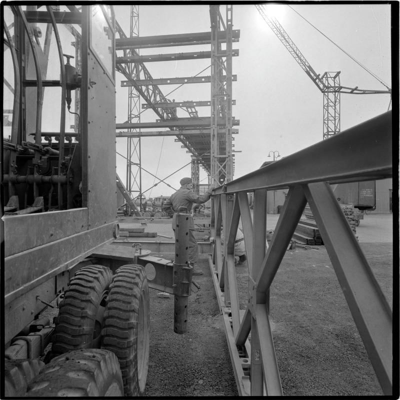 Bilden föreställer byggnad under uppförande bland annat reglverk och andra delar av konstruktioner. (gångbro?)