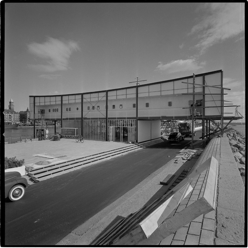 Bilden föreställer en öppen yta framför en paviljong som nästan är färdigbyggd.