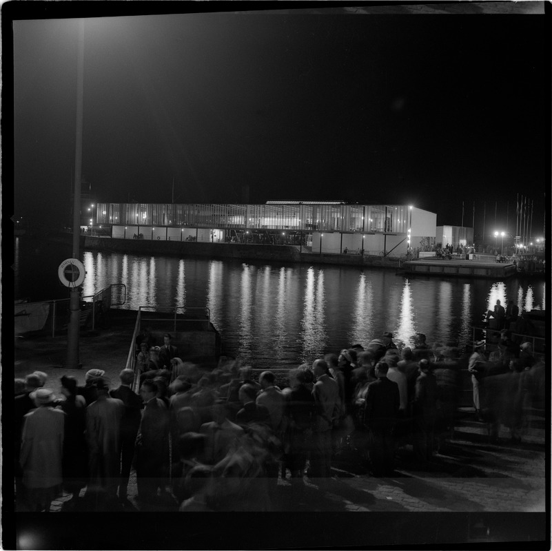 Bilden föreställer en folksamling stående på en kaj. I bakgrunden hamn och där bakom byggnad på Parapeten.