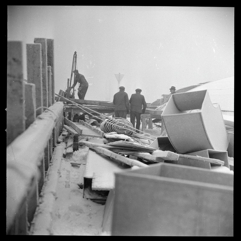 Bilden föreställer en paviljong under uppförande. I förgrunden byggnadsmaterial. Till höger början på fasad. I bakgrunden byggnadsarbetare.
