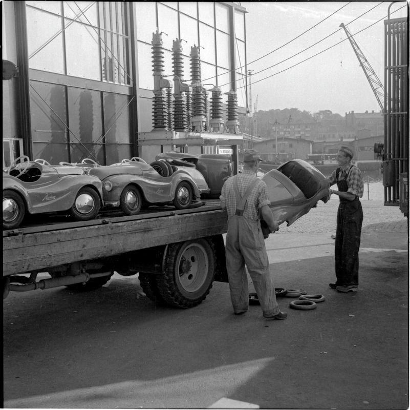 Bilden föreställer en lastbil med små bilar på flaket, två män håller på att lyfta av dem. I bakgrunden ett hus med turbiner.