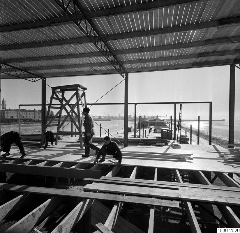 Bilden föreställer en paviljong under uppbyggnad. Troligen håller dem på att lägga golvet på våningsplan två, några personer gör det. Ovanför finns ett tak och i bakgrunden står en byggnadsstaällning. I bakgrunden utsikt över parapeten och hamnen.