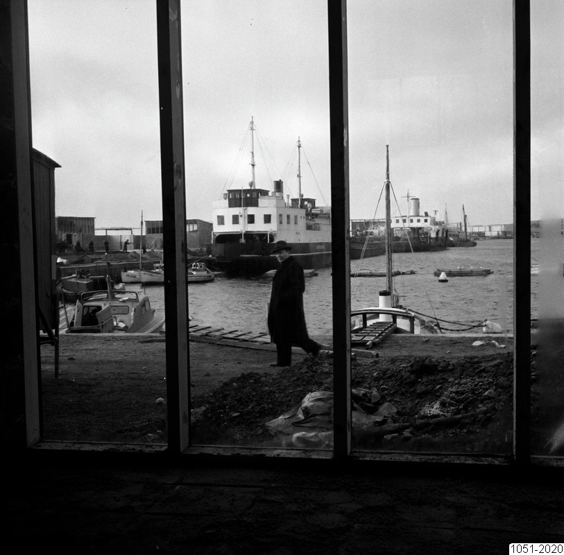 Bilden föreställer i förgrunden en glasfasad. Genom den ser man en man som går på kajen, bakom honom hamn och båtar. I bakgrunden paviljonger.