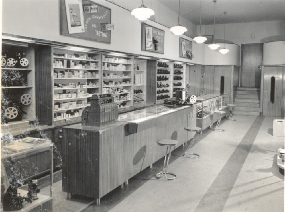 Fotografi som avbildar fotoavdelningen i Hefomas affär på Järnvägsgatan 3. På den bakre väggen ser vi även dörrar som leder till små bås där man kan lyssna på grammofonskivor ostört, dessa har bevarats och kan ses på posterna 2790 och 2791-2020. Tagen före ombyggnaden av affären 1957-58.