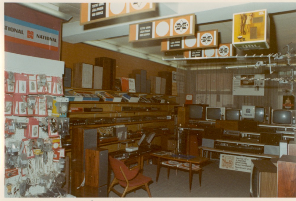 Färgfotografi från 1960-talet som avbildar insidan av Hefomas affär på Järnvägsgatan 3. Fotografiet avbildar här radio och tv avdelningen.