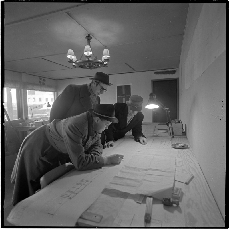 Bilden föreställer ett rum med ett bord utmed väggen. Vid bordet står tre män böjda över troligen en ritning.