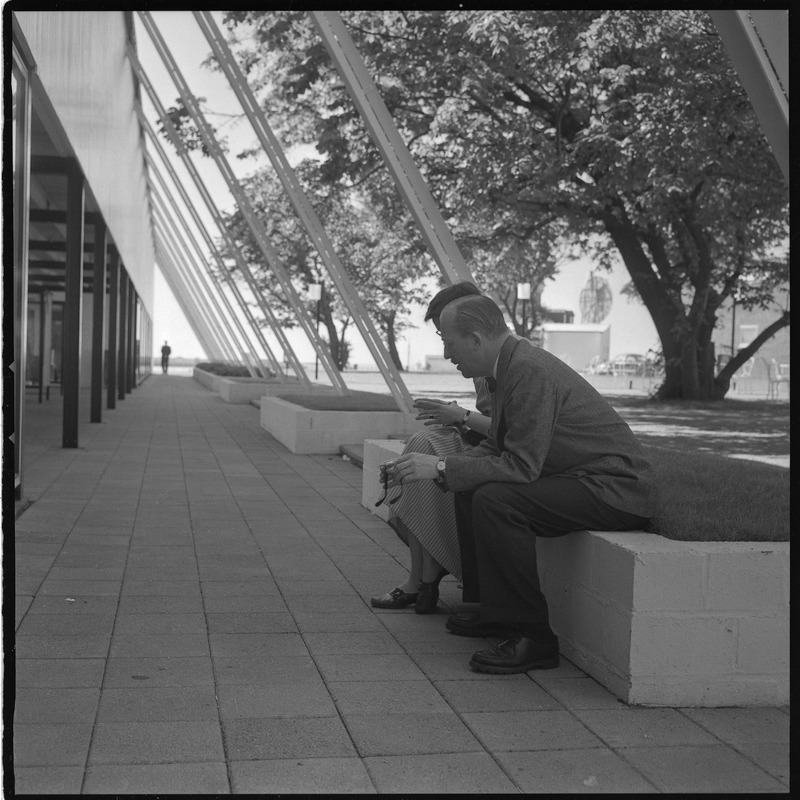 Bilden föreställer ett hus försett med stag fästa i murade rektanglar. Marken är stenlagd. I förgrunden sitter två personer i bakgrunden står några träd.
