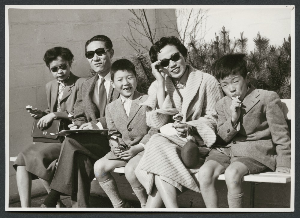 Bilden föreställer en man, två kvinnor och två barn som sitter på en bänk och äter galss.