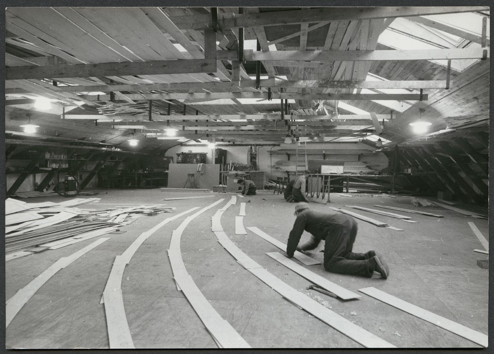 Bilden föreställer insidan av ett fartyg på mett varv med arbetare på plats.