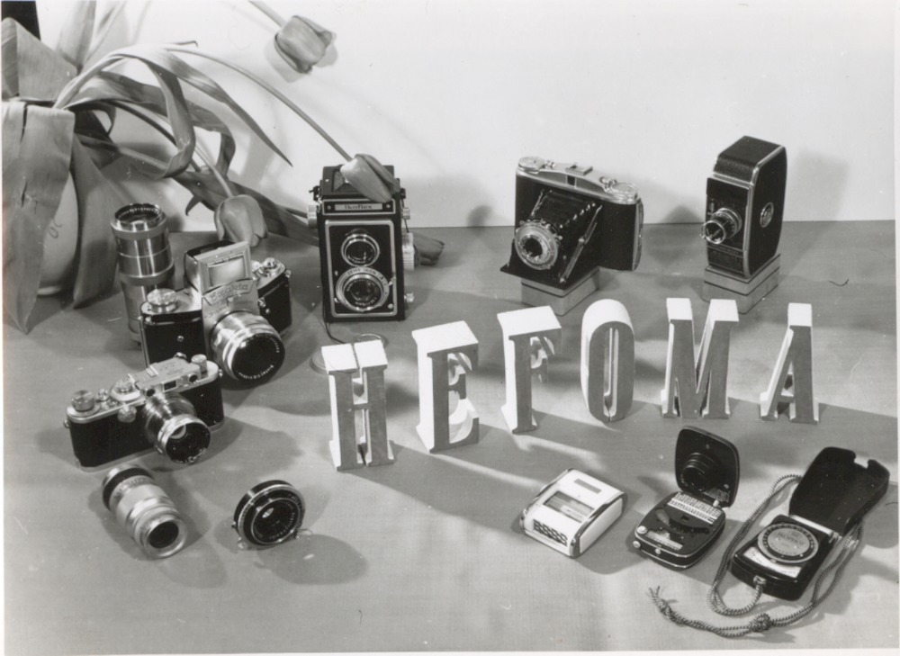 Reklamfotografi för Hefoma, hefoma utstavat med fysiska bokstäver omringat av kameor o dylik utrustning. Troligen i Hefomas affär på Järnvägsgatan 3. Bilden är troligen tagen på 1940 eller 1950-talet.