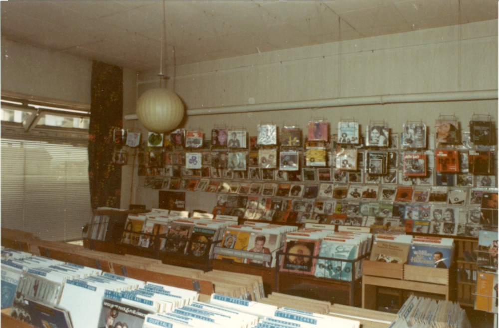 Färgfotografi från 1960-talet som avbildar insidan av Hefomas affär på Järnvägsgatan 3. Fotografiet avbildar här gammofon avdelningen.