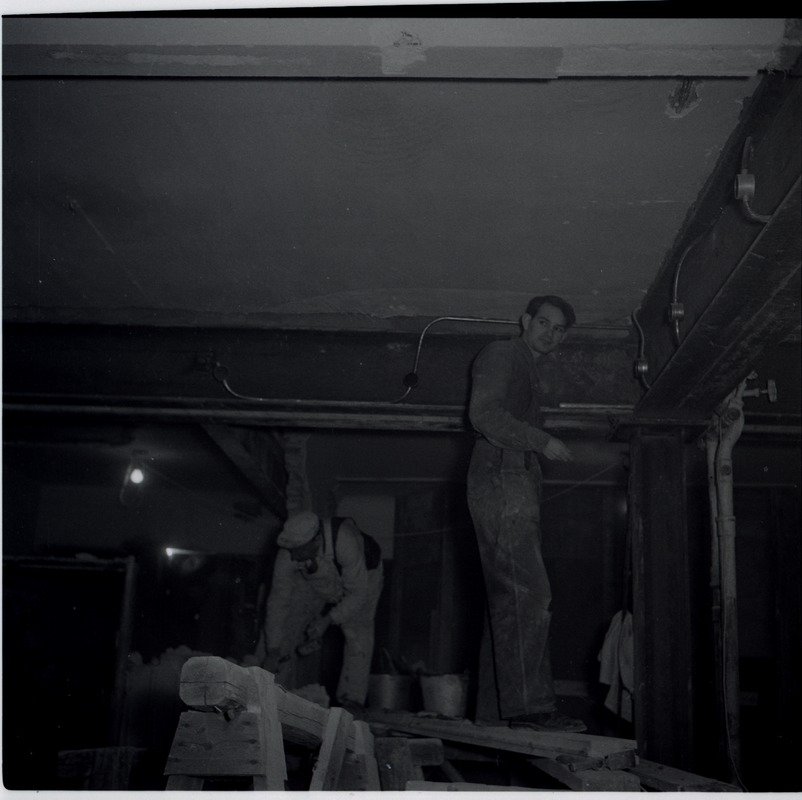 Fotografi som avbildar ombyggnaden av fastigheten som höll Hefomas affär på Järnvägsgatan 3. Här ser vi byggarbetare i arbete.