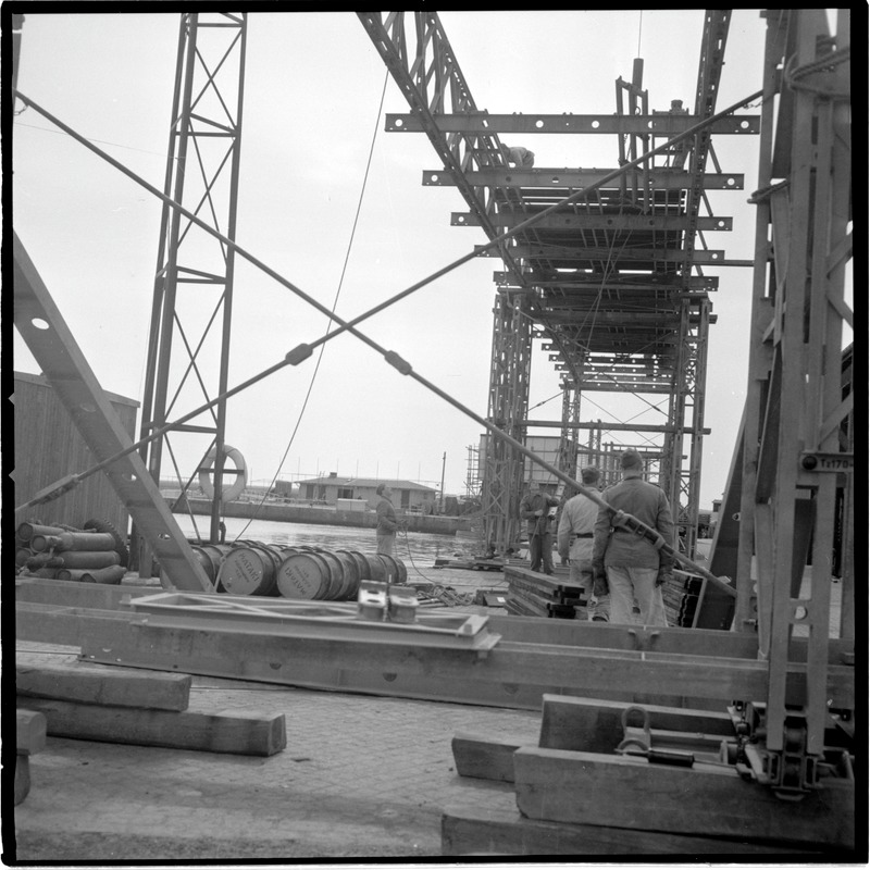 Bilden föreställer en stomme, ett regelverk till någon byggnad. På marken står troligen byggnadsarbetare. (gångbro?)