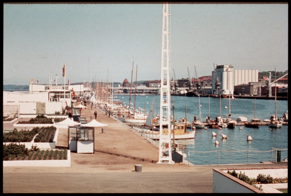 Bilden föreställer vy över utställningsområdet med plantering och byggnader till vänster och hamn med båtar till höger