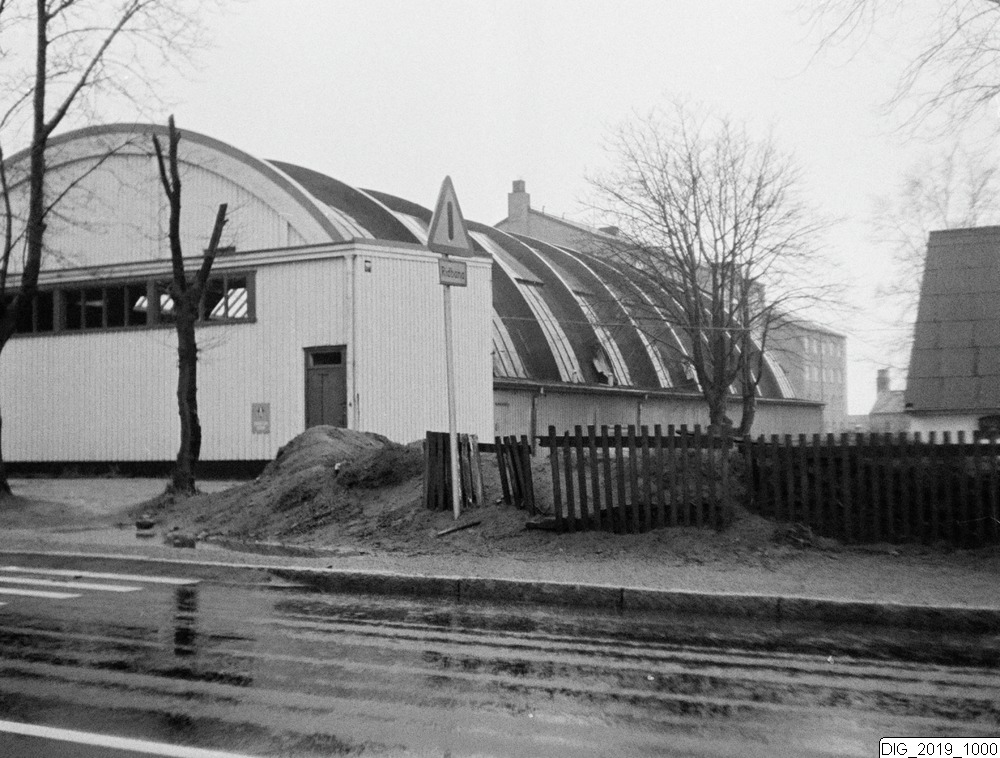 Bilden föreställer gamla ridhuset Ringstorpsvägen. I förgrunden en regnvåt gata. Där bakom trottoar och två träd, samt ett staket. I bakgrunden ridhus.
