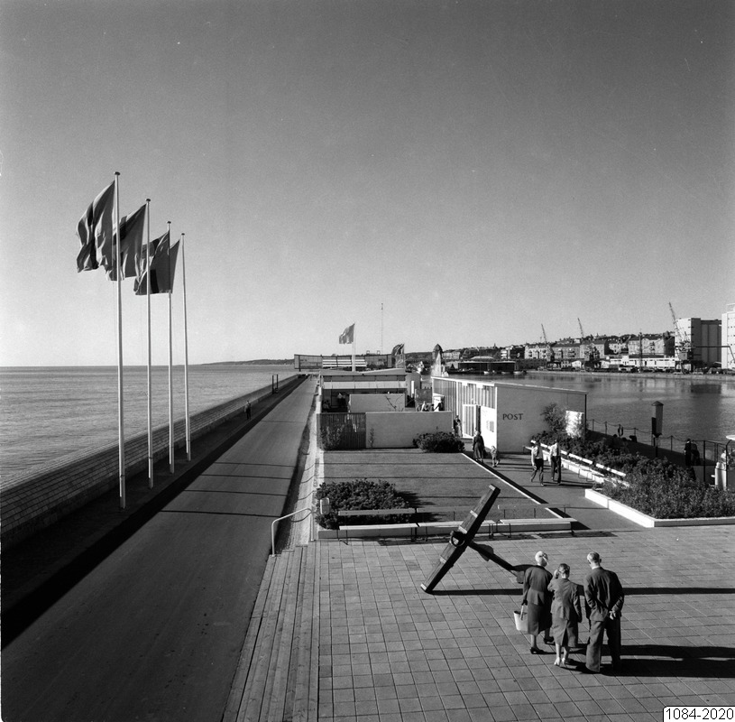 Bilden föreställer översikt över piren Parapeten. Till vänster hamn till höger mur och hav. I bakgrunden staden. På piren finns paviljonger, planteringar, människor och ett ankare samt flaggstänger med flaggor