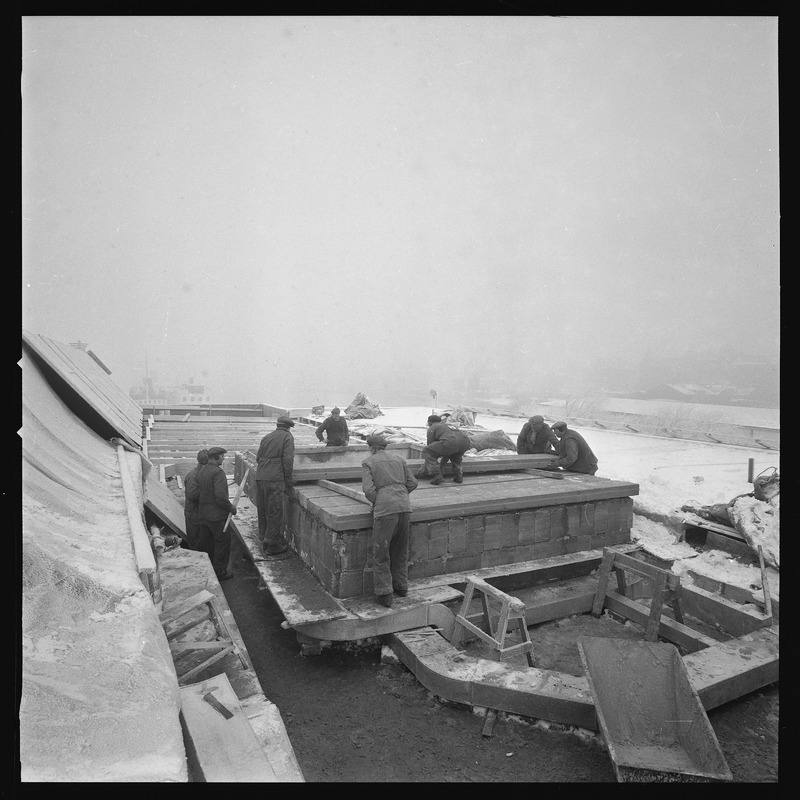 Bilden föreställer ett antal byggnadsarbetare som håller på att mura någon form av grund. Där står två byggbockar.