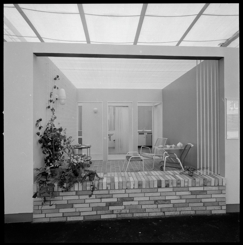 Bilden föreställer en öppen del i en fasad, nedtill tegelmur. I bakgrunden stolar och bord samt ett blomarrangemang.