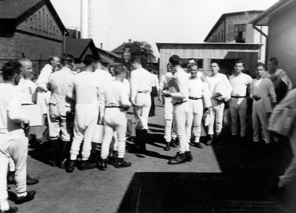 Sanitetsantstalten. Gåsebäcks industriområde Helsingborg, april/maj 1945. Röda Kors personal i mottagningen utrustas och förbereds för mottagning av fd lägerfångar.