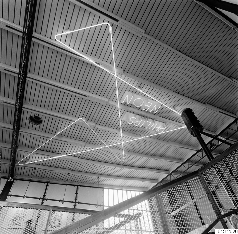 Bilden föreställer en utstälning om el under H55. I taket en neonslinga med texten inuti PHILIPS NEON. Där finns ett trafikljus monterat.