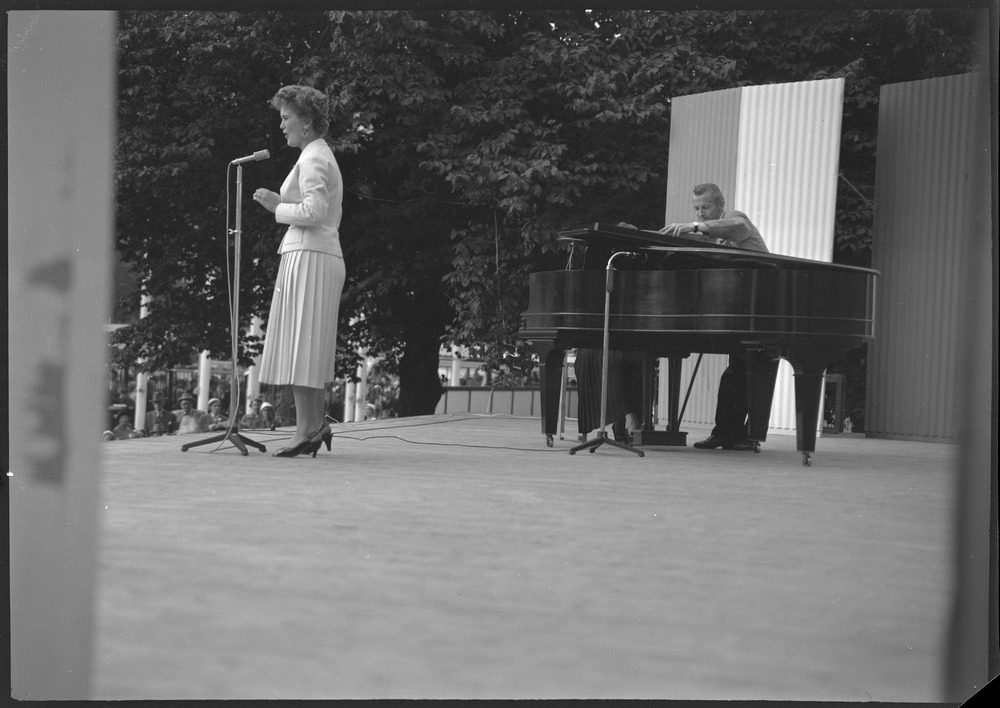 Bilden föreställer en scen på vilken det står en kvinna vid en mikrofon fotograferad från sidan. I bakgrunden en man bakom en flygel.
