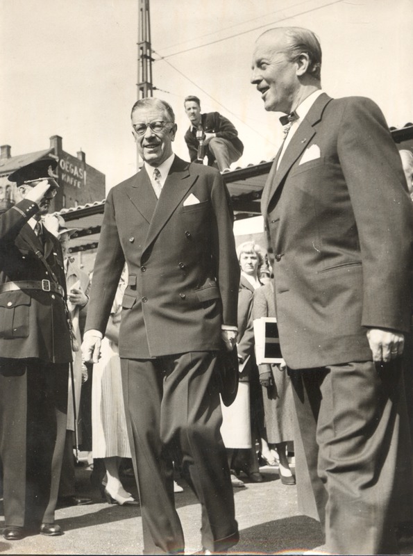 Fotografi som avbildar Kung Gustaf VI Adolf på besök i Helsingborg under festligheter med en folksamling bakom kungen med en polis till vänster i bilden, på en byggnad i bakgrunden kan man se reklam för Zoégas kaffe. Se även DIG_2020_995 och 996.