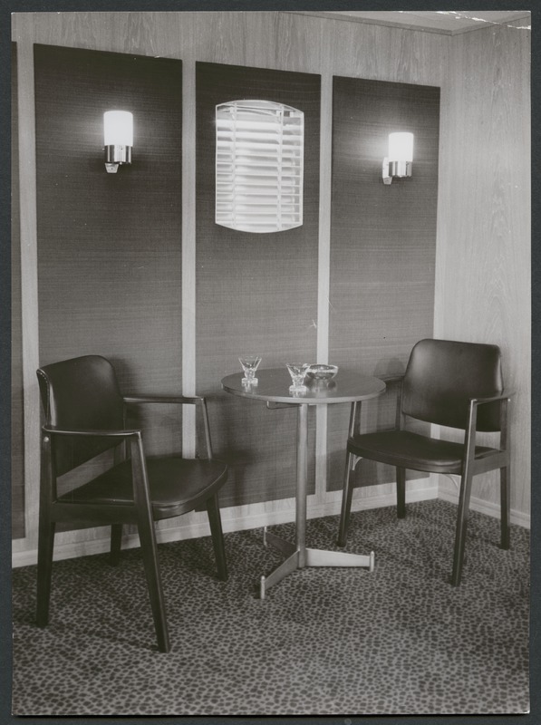 Bilden föreställer två skinnstolar, ett bord i mitten. "Om Bord". Nordiska kompaniet. Foto P.B. På bordet står två glas och en askkopp. På väggen sitter två lampor.
