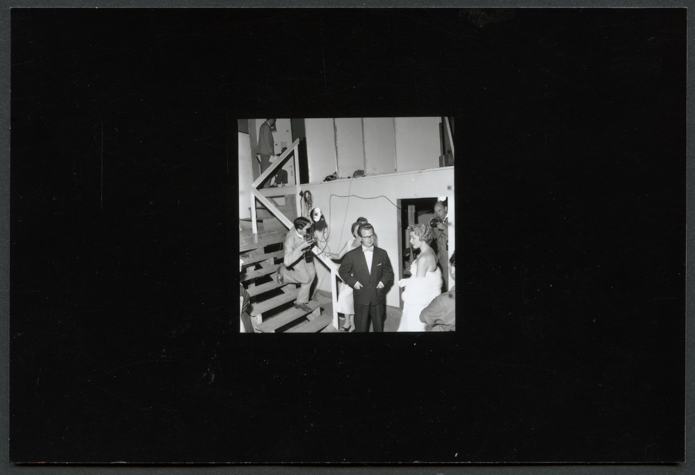 Bilden föreställer Miss Universum, Hillevi Rombin. Hillevi står och samtalar med en man nedanför en trappa där står också två fotografer.