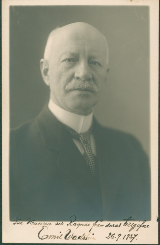 Svartvitt fotografi föreställande Emil Wadstein. Med dedikation till Hanna och Ragnar, som är Hanna Barnekow, född Wadstein och hennes make Ragnar Barnekow. Emil är Hannas farbror, bror till hennes far Albert Wadstein.