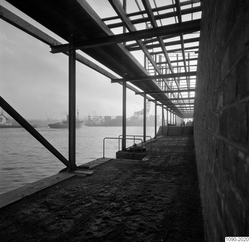 Bilden föreställer en gångbana tillika kajkant med fasad till höger och tak under uppbyggnad upptill. Till vänster hamn och fartyg.